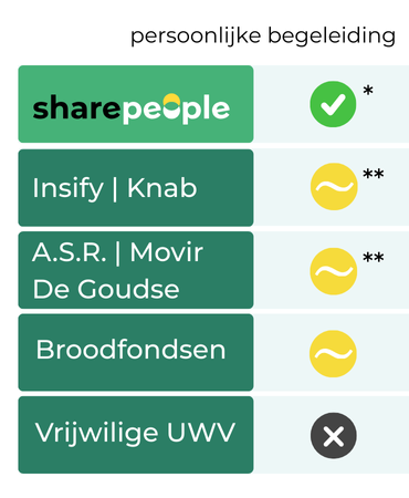 Waar het UWV een wachttijd heeft van 2 jaar, ontvang je met de SharePeople AOV (Plus) al na 2 maanden inkomen. Daarnaast krijg je vanaf dag 1 persoonlijke begeleiding.