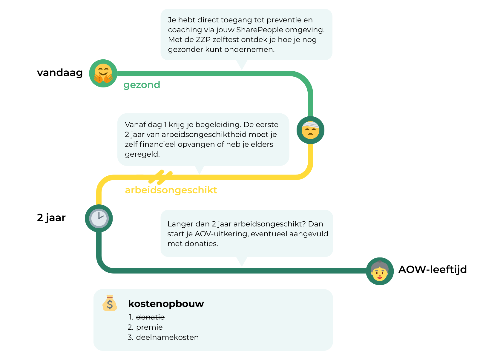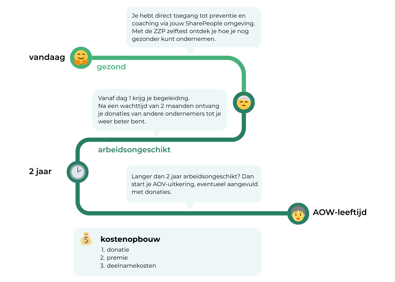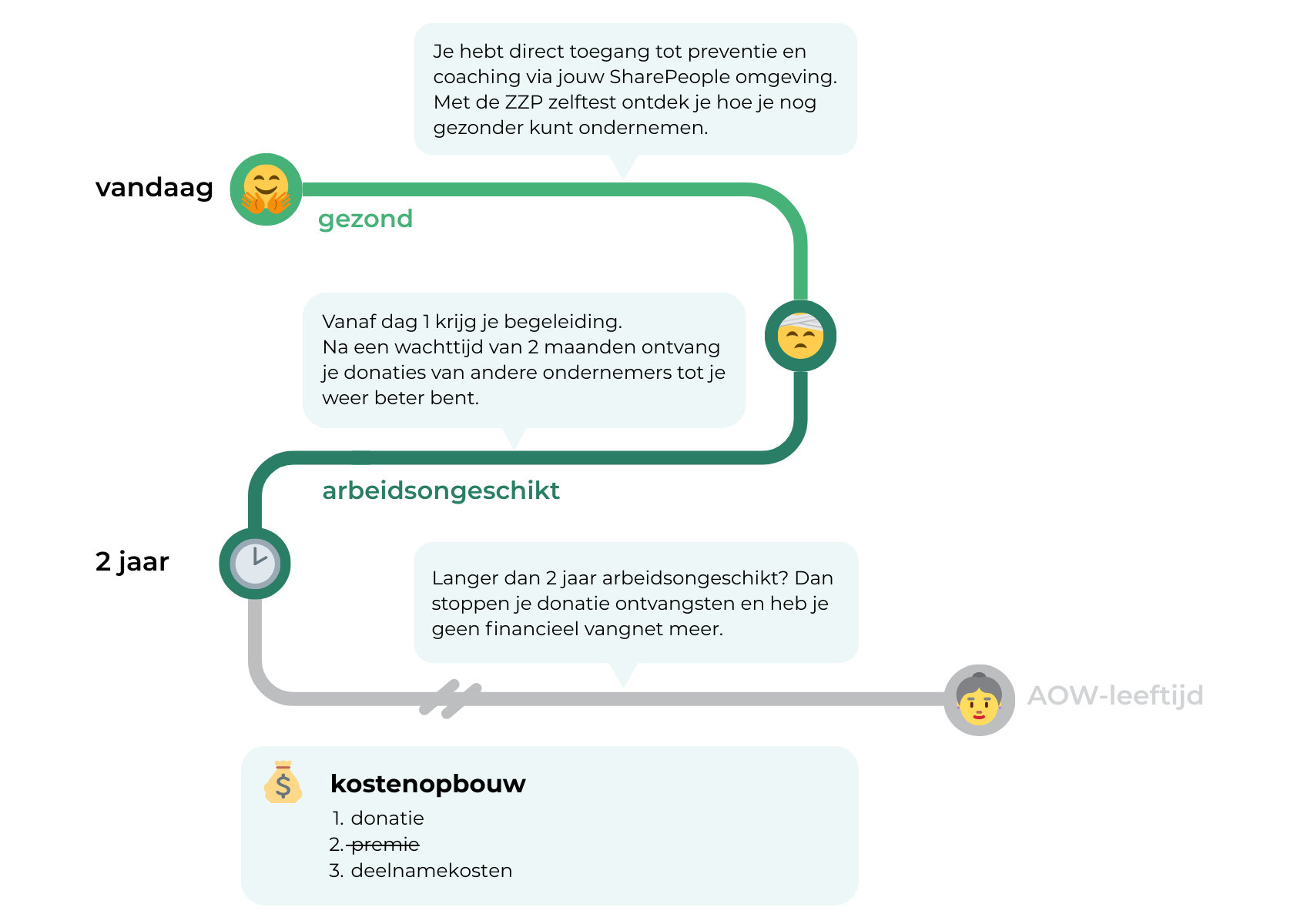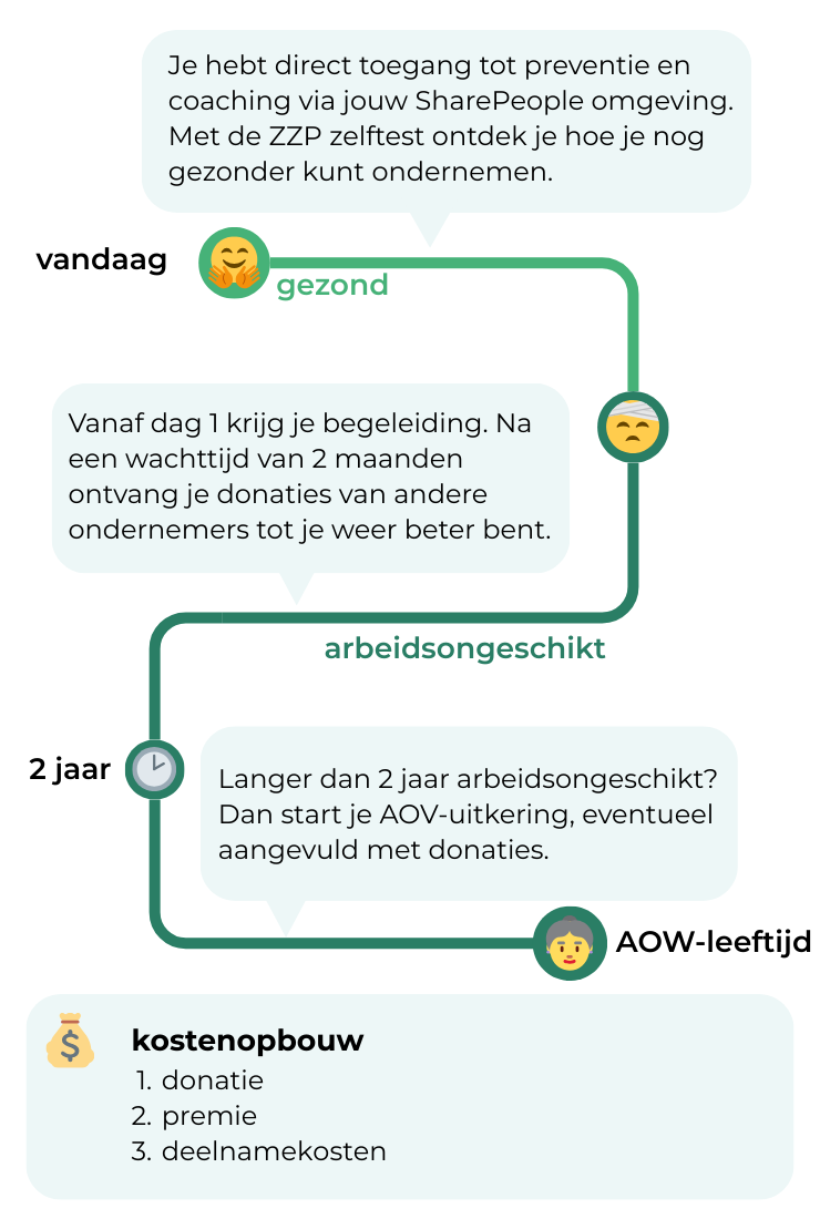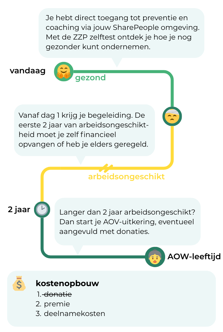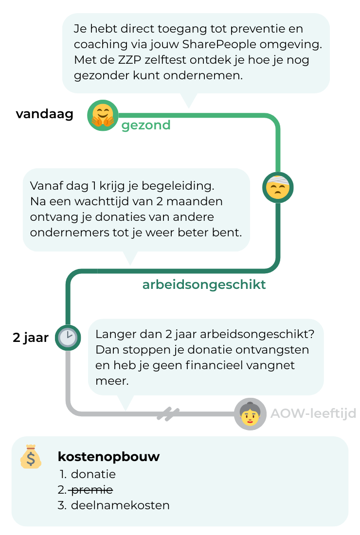 Bij SharePeople werkt het anders: je doneert rechtstreeks aan elkaar. Geen verborgen kosten, alleen een klein vast lidmaatschapsbedrag voor begeleiding en re-integratie. Zo houden we elkaar gezond en blijft een AOV betaalbaar.